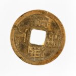 A round copper alloy coin with a square hole in the centre, called fangkong qian 方孔錢. These appeared in various denominations, mostly as tongbao 通寶 (“common currency”) coins, which were worth one monetary unit, yuanbao 元寶 (“original currency”) and zhongbao 重寶 (“heavy currency”), which had higher denominations. In many varieties and denominations, such coins had been in circulation as standard money since the time of Emperor Gaozu 高祖 (reigned 618–626), the first emperor of the Tang Dynasty (618–907). In 621, he introduced a new coinage standard with the issue of the Kaiyuan tongbao 開元通寶 coin. Its name could be translated as “money in circulation at the beginning of a new era” because kai 開 (open, begin) and yuan 元 (new, first, original), read vertically from top to bottom, mean “opening a new era”, while tong 通 (circulate, ... more