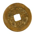 A round copper alloy coin with a square hole in the centre, called fangkong qian 方孔錢. These appeared in various denominations, mostly as tongbao 通寶 (“ordinary currency”) coins, which were worth one monetary unit, and yuanbao 元寶 (“original currency”) and zhongbao 重寶 (“heavy currency”), which had a higher face value. Such coins were in circulation as standard money, in many varieties and denominations, from the time of Emperor Gaozu 高祖 (reigned 618–626), first emperor of the Tang Dynasty (618–907), until the end of the Qing Dynasty (1644–1912). The inscription on the coin usually consists of two characters, reading from top to bottom, indicating the name of the imperial reign or the single reign period (nianhao 年號) in which the coin was minted. The other two characters are read from right to left. On the left-hand side of the coin, we always find the character bao 寶 (wealth, preciousness), which in combination with the character on the right means “currency” or “money in circulation”. This is most often the character tong 通 (circulate, be uniform, general, or universal), but often it is also yuan 元 (original) or zhong 重 (weight), which usually denote coins with a larger face value. Thus, the entire inscription literally means “money in circulation during the time of this or that emperor” or “during this or that period of the reign of a single emperor”. Coins from the time of the last, Manchu Qing dynasty have, in addition to the inscription in four Chinese characters on the obverse, an inscription on the reverse, usually indicating the location of the mint. It was originally written in Chinese, then in Chinese and Manchu, and finally only in Manchu.